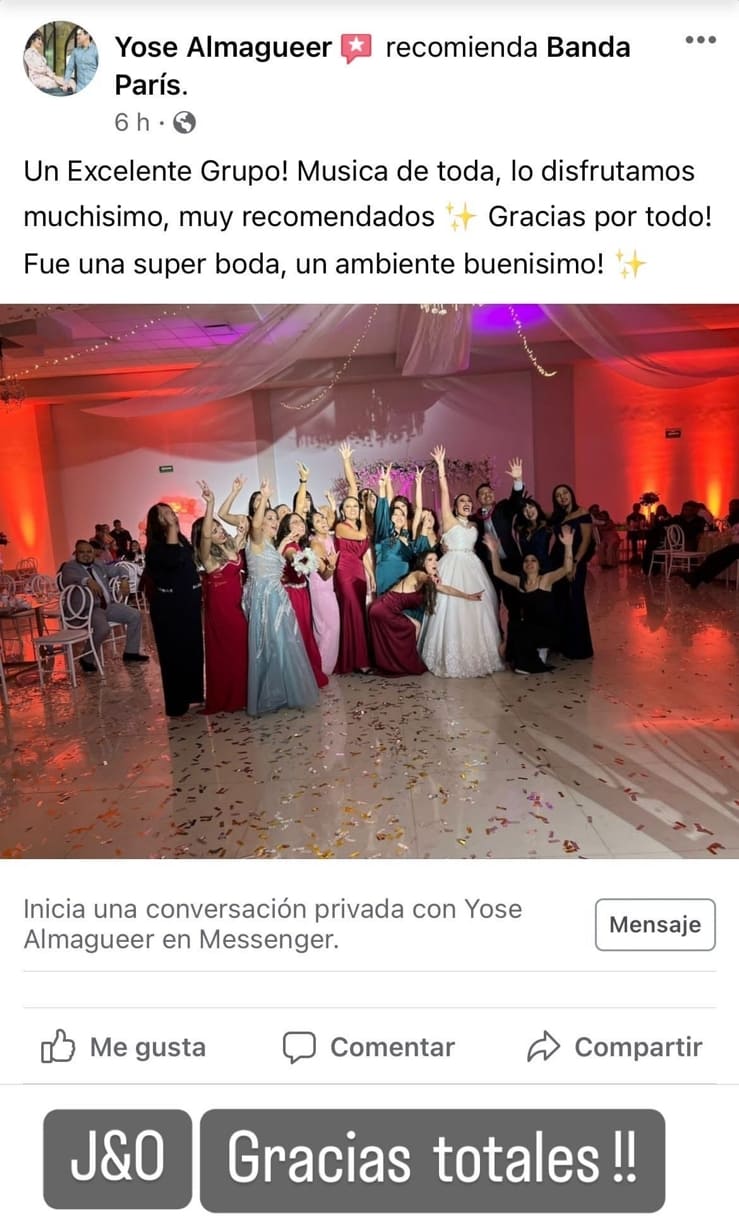 Somos una empresa dedicada a Musicalizar y ambientizar Historias de amor creando sensaciones inolvidables que te haran bailar y cantar durante horas con nuestra gran selección de generos! Mezclamos una conjunto de servicios adicionales que harán de tu fiesta un evento inolvidable. Combinando buena música, ambientación y calidad haremos de tu evento, el mejor! Estas a un paso de tener una excelente agrupación en tu celebración. Contactanos Disponible para cualquier tipo de evento social.